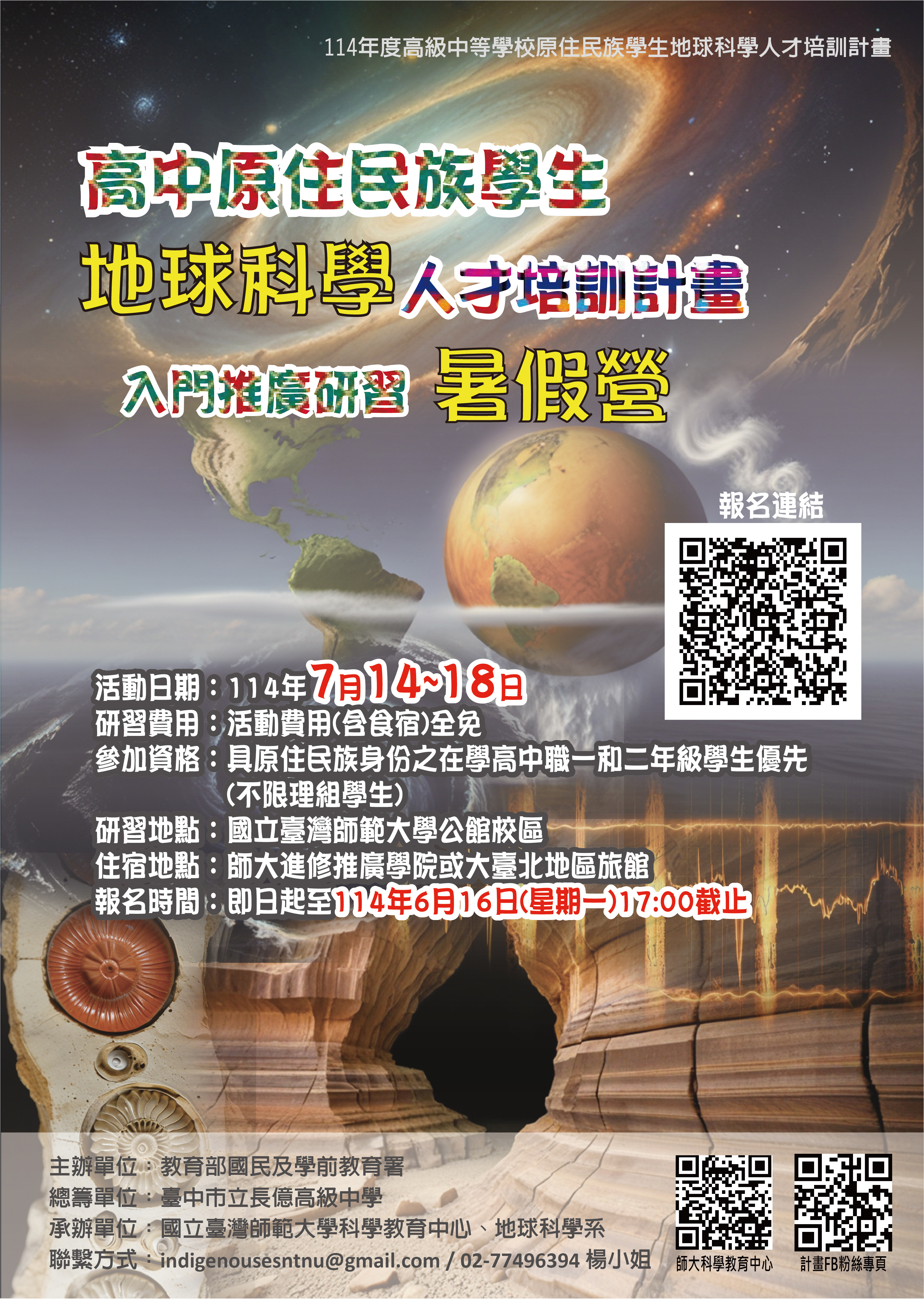 「114年度高級中等學校原住民族學生地球科學人才培訓計畫」第二次入門推廣(暑假營),即日起開放報名,歡迎高中原住民族學生報名參加,詳見連結簡章。 2025-05-14 周怡君 1. 「114年度高級中等學校原住民族學生地球科學人才培訓計畫」第二次入門推廣研習簡章 2. 宣傳單張 3. 學生和家長同意書
